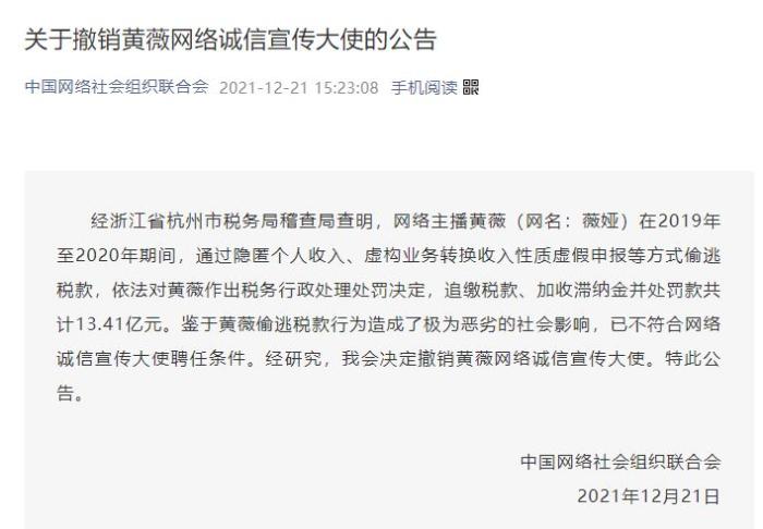 中新網(wǎng)12月21日電 據(jù)中國網(wǎng)絡(luò)社會(huì)組織聯(lián)合會(huì)微信公眾號(hào)消息,經(jīng)浙江省杭州市稅務(wù)局稽查局查明,網(wǎng)絡(luò)主播黃薇(網(wǎng)名:薇婭)在2019年至2020年期間,通過隱匿個(gè)人收入、虛構(gòu)業(yè)務(wù)轉(zhuǎn)換收入性質(zhì)虛假申報(bào)等方式偷逃稅款,依法對(duì)黃薇作出稅務(wù)行政處理處罰決定,追繳稅款、加收滯納金并處罰款共計(jì)13.41億元。鑒于黃薇偷逃稅款行為造成了極為惡劣的社會(huì)影響,已不符合網(wǎng)絡(luò)誠信宣傳大使聘任條件。經(jīng)研究,中國網(wǎng)絡(luò)社會(huì)組織聯(lián)合會(huì)決定撤銷黃薇網(wǎng)絡(luò)誠信宣傳大使。