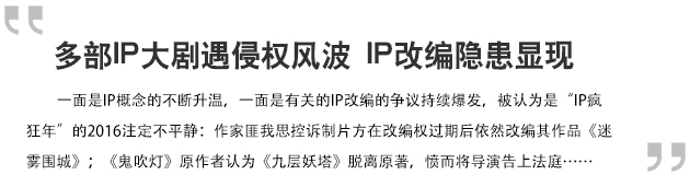從2010年的剛過(guò)100億元到2015年的440億元,中國(guó)電影票房突飛猛進(jìn)。隨著銀幕增長(zhǎng)數(shù)量向三四線城市下沉,中國(guó)電影市場(chǎng)依然具備巨大的發(fā)展?jié)摿?吸引了大量投資者蜂擁而入。一位網(wǎng)絡(luò)文學(xué)版權(quán)買手表示,今年初,一部熱門網(wǎng)絡(luò)小說(shuō)的版權(quán)可以賣到千萬(wàn)元級(jí)別,因此,天價(jià)續(xù)約、改編權(quán)轉(zhuǎn)賣的現(xiàn)象都很常見(jiàn),IP作品對(duì)市場(chǎng)的吸引力依然巨大。例如,由周迅主演的電視劇《如懿傳》單集售價(jià)1500萬(wàn)元,這樣的天價(jià)讓不少人垂涎欲滴、蠢蠢欲動(dòng)。