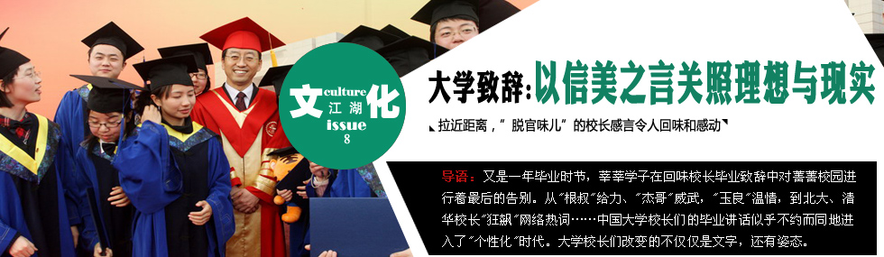 火熱的六月,不僅有熱情,也有傷感。又到一年畢業(yè)時,畢業(yè)生們離開亦愛亦恨的校園,踏上有苦有甜的社會。2010年的畢業(yè)致辭似乎比往年都火,既有時髦的“根叔”,也有深沉的蘇力。