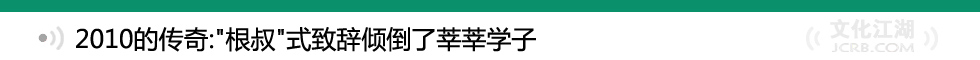 “根叔”是2010年的一個傳奇。作為華中科技大學校長,李培根因為一篇名為《記憶》的畢業(yè)致辭火了。因為這篇致辭,他被親昵地稱為“根叔”;在致辭里,他串聯(lián)了許多網(wǎng)絡潮語,“媽媽喊你回家吃飯”、“什么是母校?就是那個你一天罵他八遍卻不許別人罵的地方”;他說,“未來有一天,或許當年的記憶會讓你們問自己,曾經(jīng)是姐的娛樂,還是哥的寂寞?” ?【詳細