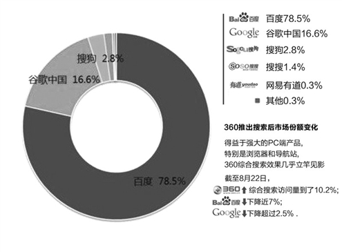 略顯簡陋的360綜合搜索,輕易地撥出了一圈漣漪,同為借勢瀏覽器的搜狗趕緊拋出“亦敵亦友”的論調(diào),百度看似坐懷不亂,卻遭遇股價一周下跌13 .6%。搜索領(lǐng)域“3BS大戰(zhàn)”一觸即發(fā),外來軍谷歌躺著中槍。
