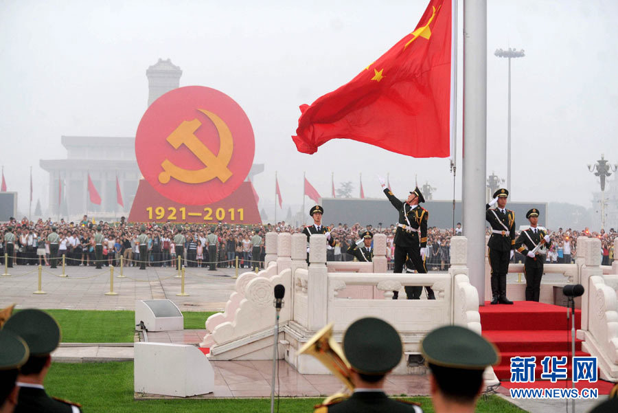 7月1日,國旗護衛(wèi)隊戰(zhàn)士護送國旗走向升旗臺。當日,來自全國各地的數(shù)萬名群眾匯聚北京天安門廣場,觀看隆重的升旗儀式,紀念中國共產(chǎn)黨成立90周年。 新華社記者 羅曉光 攝