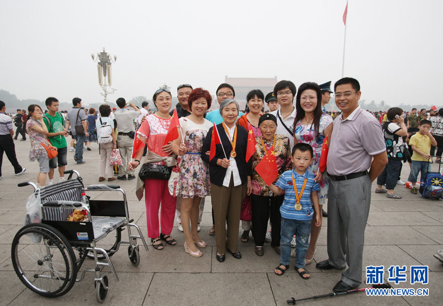 7月1日,五世同堂的楊明聰(前排左四)一家人在天安門廣場前合影留念。當日,來自全國各地的數(shù)萬名群眾匯聚北京天安門廣場,觀看隆重的升旗儀式,紀念中國共產(chǎn)黨成立90周年。 新華社發(fā)(萬象 攝)