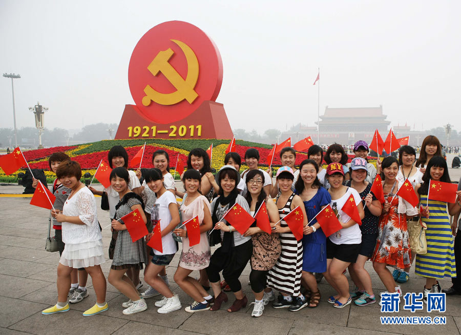 7月1日,一隊游客在廣場“紅心向黨”花壇前合影。當日,來自全國各地的數(shù)萬名群眾匯聚北京天安門廣場,觀看隆重的升旗儀式,紀念中國共產(chǎn)黨成立90周年。 新華社發(fā)(李方宇 攝)