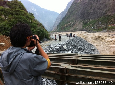 記者在國(guó)道213垮塌現(xiàn)場(chǎng)拍攝,現(xiàn)場(chǎng)滾石聲隆。ㄈA西都市報(bào)記者 李逢春 攝)