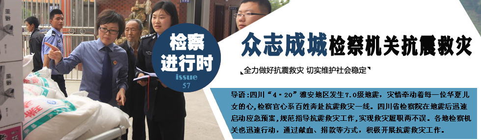 4月20日上午八點零兩分,四川省雅安地區(qū)發(fā)生強烈地震,給全市造成了極大損失。檢察干警在自身受災的情況下,以災民利益為重,舍小家顧大家,奔赴受災一線,全力投入搶險救災工作。