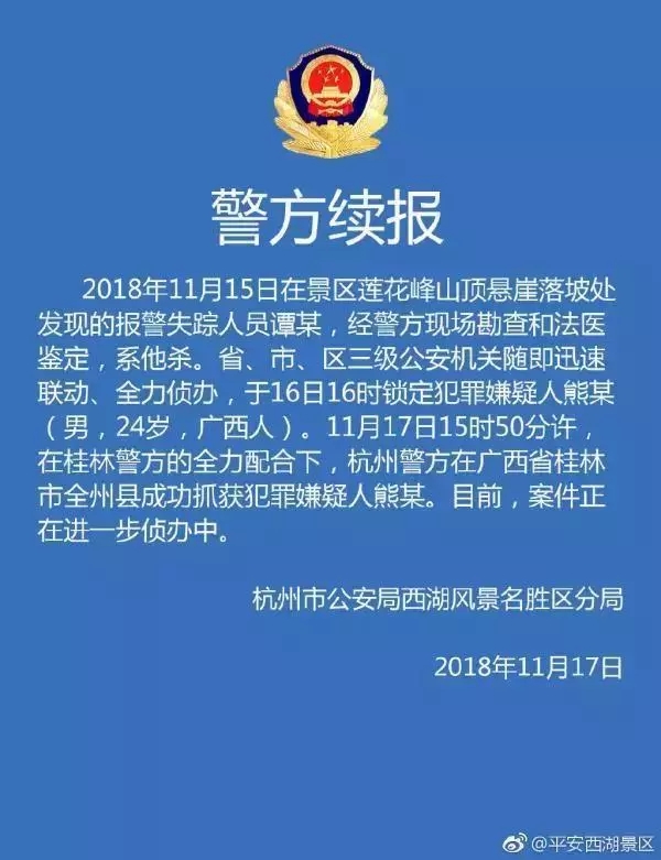2018年11月15日,在景區(qū)蓮花峰山頂懸崖落坡處發(fā)現的報警失蹤人員譚某,經警方現場勘查和法醫(yī)鑒定,系他殺。