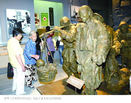 雕塑《苦難的中國人民》勾起了老人對兒時的回憶。