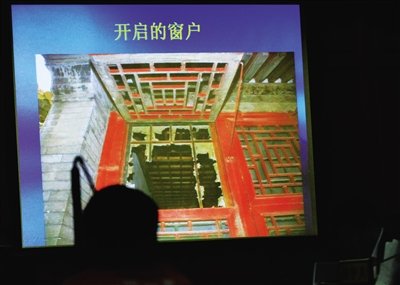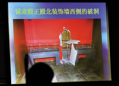 進(jìn)入誠肅殿內(nèi)后,石柏魁摸索到一面墻。敲擊感覺不是石墻,于是手腳并用扒開一個(gè)破洞,從洞口鉆進(jìn)事發(fā)現(xiàn)場(chǎng)的展廳。
