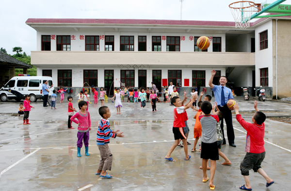 2012年9月4日,江西省安遠(yuǎn)縣雙芫鄉(xiāng)津槎小學(xué)的孩子們開心的在該縣檢察院"三送"工作組奉獻(xiàn)愛心捐款幫助硬化好的水泥操場上打籃球、打乒乓球、跳繩、做游戲。