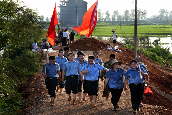 2012年6月,江西省豐城市清豐山河段潭鄉(xiāng)流域發(fā)現(xiàn)嚴(yán)重險(xiǎn)情,豐城市人民檢察院迅速調(diào)集院應(yīng)急小分隊(duì)與段潭鄉(xiāng)干部群眾一起參與防汛工作。圖為險(xiǎn)情排除后干警凱旋歸來(lái)的情景。