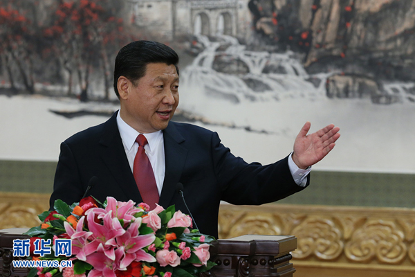 11月15日,剛剛在中共十八屆一中全會上當(dāng)選的中共中央總書記習(xí)近平和中央政治局常委李克強(qiáng)、張德江、俞正聲、劉云山、王岐山、張高麗在北京人民大會堂同采訪十八大的中外記者親切見面。這是習(xí)近平總書記發(fā)表講話。新華社記者謝環(huán)馳攝