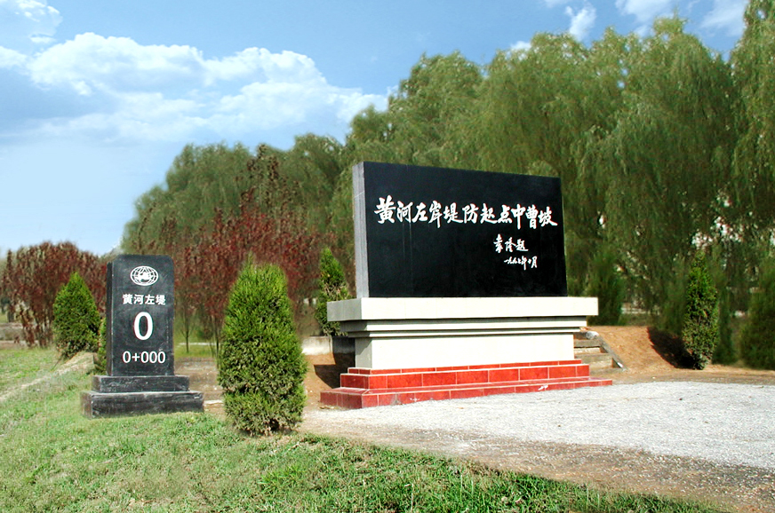 千里黃河左岸堤防修筑于清乾隆二十一年(公元1756年)。解放前,大堤由于年久失修,每當(dāng)洪水來(lái)臨,常常坍塌滑坡,無(wú)法抵御黃河洪水起到防洪作用,F(xiàn)在我們所看到的黃河大堤是新中國(guó)成立后,黨中央、國(guó)務(wù)院對(duì)黃河治理非常重視,在歷史堤防的基礎(chǔ)之上,先后對(duì)黃河進(jìn)行了3次大規(guī)模的復(fù)堤。左岸自孟州中曹坡村大王廟高崖起,到黃河入海口山東墾利縣境,全長(zhǎng)700公里。孟州境內(nèi)的堤防于1974年至1975年又培修增高,形成今日的黃河大堤,全長(zhǎng)15.43公里。在孟州市中曹坡村頭,可親眼目睹為紀(jì)念人民治黃五十年的豐功偉績(jī),由孟州河務(wù)局自行設(shè)計(jì)、施工建造的黃河左岸堤防起點(diǎn)紀(jì)念碑。該碑由碑座與石碑兩部分組成,共分四層,碑座上部為淺綠色,象征著環(huán)保與平安,預(yù)示著黃河將變清變綠,永得安瀾;石碑由一近5噸重的整塊南山青石制作,總高3米,碑座底部為紅色,象征著奔放熱烈,代表了3萬(wàn)多名治黃職工對(duì)母親河的深情;碑面長(zhǎng)2.86米,代表黃河流經(jīng)孟州市境內(nèi)28.6公里;高1.543米,代表孟州境內(nèi)整個(gè)堤防長(zhǎng)度15.43公里;碑厚0.3米,表示孟州市有逯村、開(kāi)儀、化工3處控導(dǎo)工程。