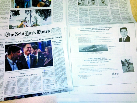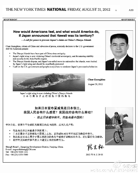 這則刊于8月31日《紐約時報》A19版上的半版廣告,以中英文兩種語言刊出,標題直接反問美國讀者:“如果日本宣布夏威夷是日本領(lǐng)土,美國人民會有什么感受?美國政府會有什么舉動?”“防止日本人破壞和平,釣魚島是中國的!”全文內(nèi)容為:“中國公民、世界和平使者陳光標鄭重向美國政府、美國人民聲明:釣魚島自古以來就是中國的領(lǐng)土。日本右翼分子正在侵犯中國領(lǐng)土主權(quán),正在破壞西太平洋地區(qū)的穩(wěn)定和安全。堅決抗議日本右翼分子最近挑起的釣魚島爭端和所謂購買釣魚島、進行國有化的舉動。我呼吁美國政府和各界人士譴責日本的挑釁行為。”落款處還附上了郵箱“zuguozhishang@126.com”,用戶名即為“祖國至上”的拼音。