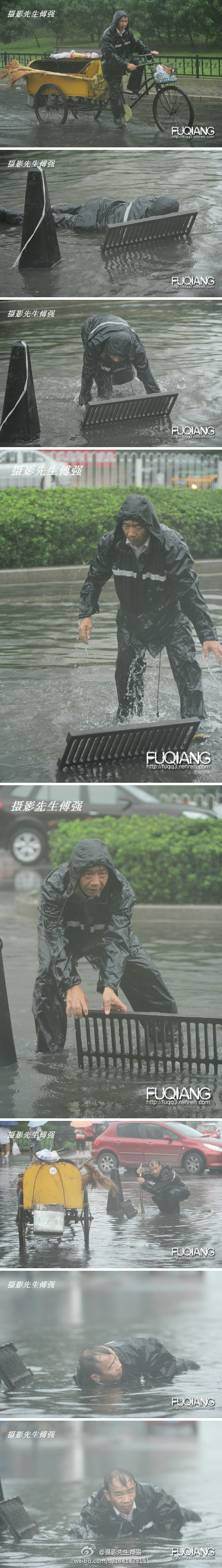 在傅強(qiáng)昨天拍攝的眾多照片中,一組名為“首都清潔工”的照片感動了無數(shù)網(wǎng)友。八張照片中的主人公都是一位中年環(huán)衛(wèi)工人,從圖片上看,盡管身穿黑色雨衣,這位環(huán)衛(wèi)工人還是被大雨澆個(gè)濕透,為了疏通堵塞的排水孔,他的整個(gè)身子都幾乎埋進(jìn)水中。