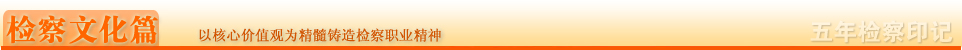 ◆原則:堅持眼睛向內(nèi)、重心向下、以我為主的原則,充分發(fā)揮檢察文化陶冶情操、鼓舞士氣、凝聚人心的作用。要堅持實事求是、因地制宜,積極穩(wěn)妥地推進(jìn)檢察文化建設(shè)。