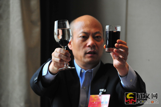 全國人大代表、浙江省海寧市斜橋鎮(zhèn)華豐村黨委書記朱張金向記者展示他帶來的部分問題食品。正義網(wǎng)記者程丁 攝