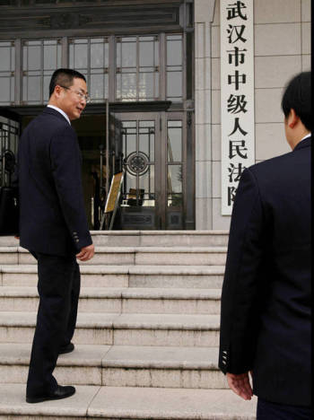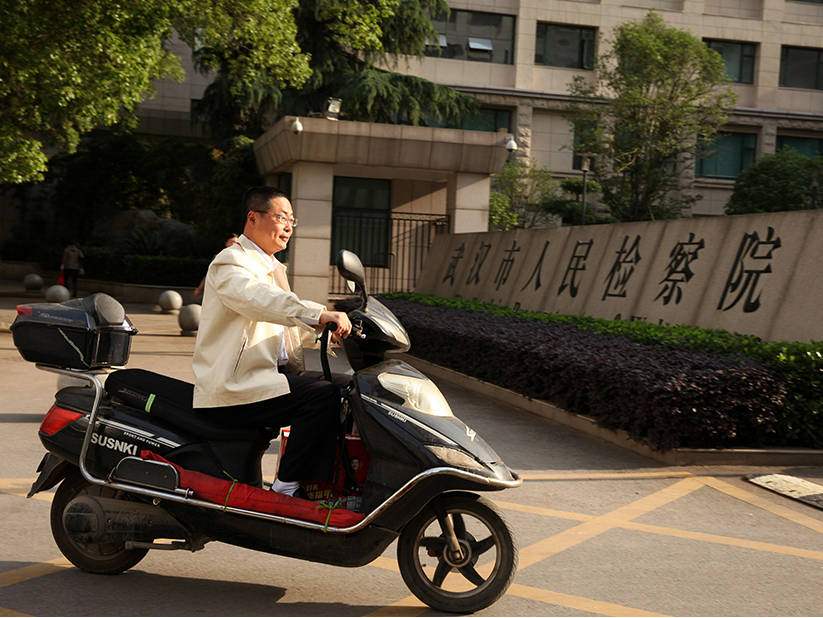 2014年5月5日上午,震驚社會的武漢男子砍殺女環(huán)衛(wèi)工案在武漢市中級人民法院開庭審理。開庭當(dāng)天清晨,公訴人付建中和往常一樣,開著他的小摩托來上班。到了辦公室,他整理了一下出庭資料,換上制服,精神抖擻地與同伴一起出發(fā)了。劉明 攝