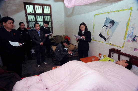 開庭當(dāng)天,檢察官、法官帶領(lǐng)著書記員、法警冒著嚴(yán)寒來到被告人家中,在被告人的病床邊完成了案件庭審。