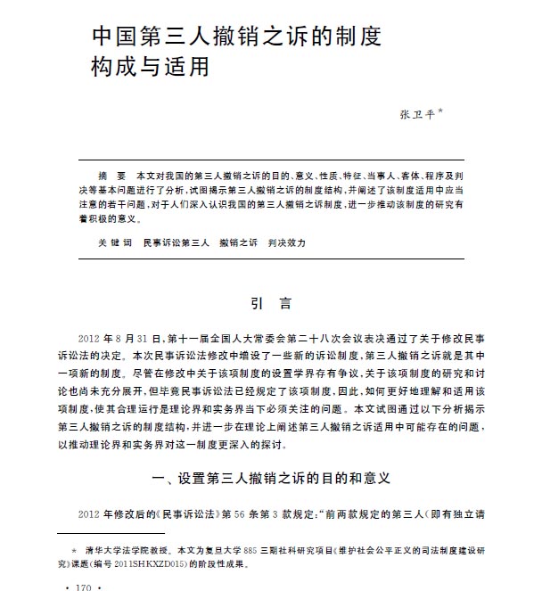 本文對我國第三人撤銷之訴的目的、意義、性質(zhì)、特征、當事人、客體、程序及判決等基本問題進行了分析,試圖揭示第三人撤銷之訴的制度結(jié)構(gòu),并闡述了該制度適用中應當注意的若干問題,對于人們深入認識我國的第三人撤銷之訴制度,進一步推動理論界和實務(wù)界對這一制度更深入的探討有著積極的意義。