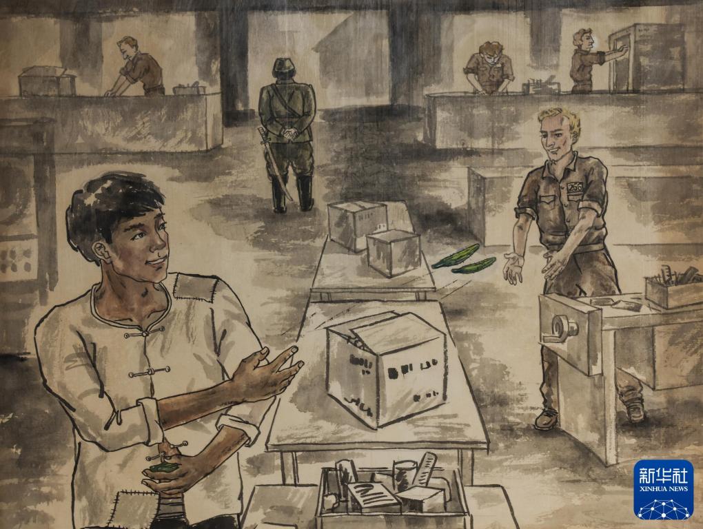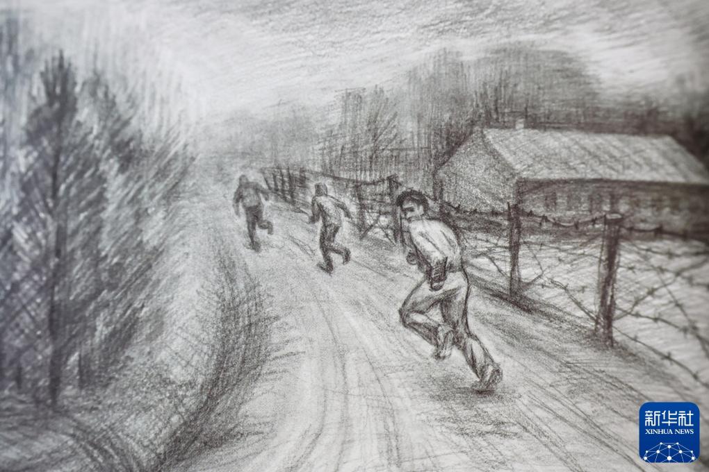 沈陽二戰(zhàn)盟軍戰(zhàn)俘營舊址陳列館內(nèi)展出的繪畫作品(翻拍照片)。