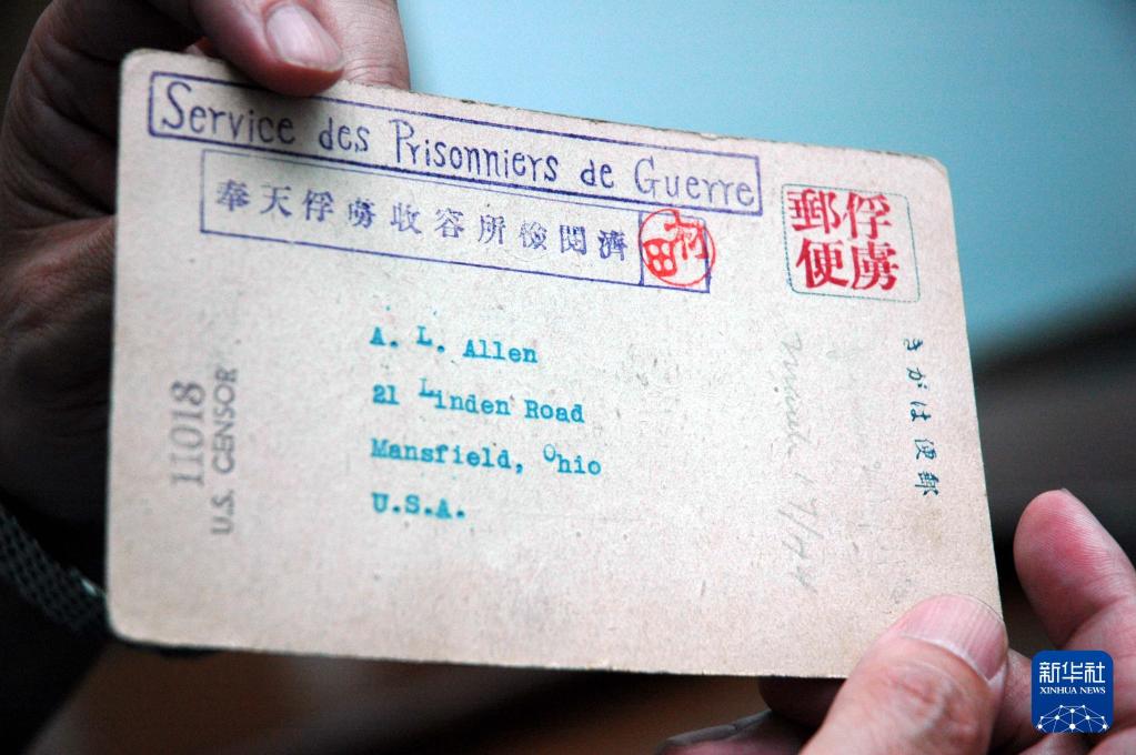 這是當(dāng)年戰(zhàn)俘們寄給親友的實(shí)寄明信片(2008年7月31日攝)。64開的明信片上有“俘虜郵便”“奉天俘虜收容所檢閱濟(jì)”的明顯印記,這些私人信件當(dāng)年要經(jīng)過日軍的嚴(yán)格審查,蓋上戰(zhàn)俘營司令官松田的名章后才能寄出。2008年7月31日,200余件二戰(zhàn)時(shí)期美國老兵珍藏的文物史料,被捐贈(zèng)給沈陽二戰(zhàn)時(shí)期盟軍戰(zhàn)俘營舊址紀(jì)念館。