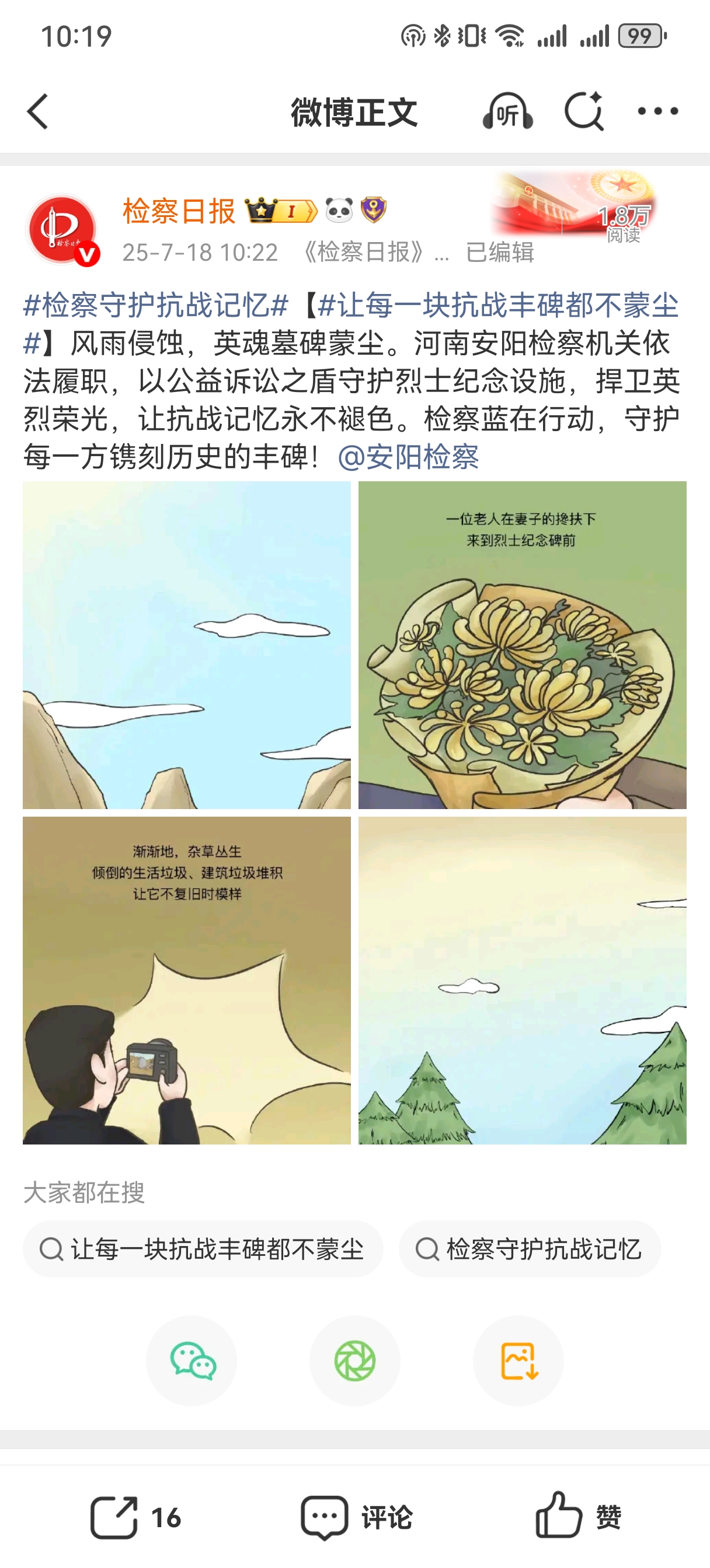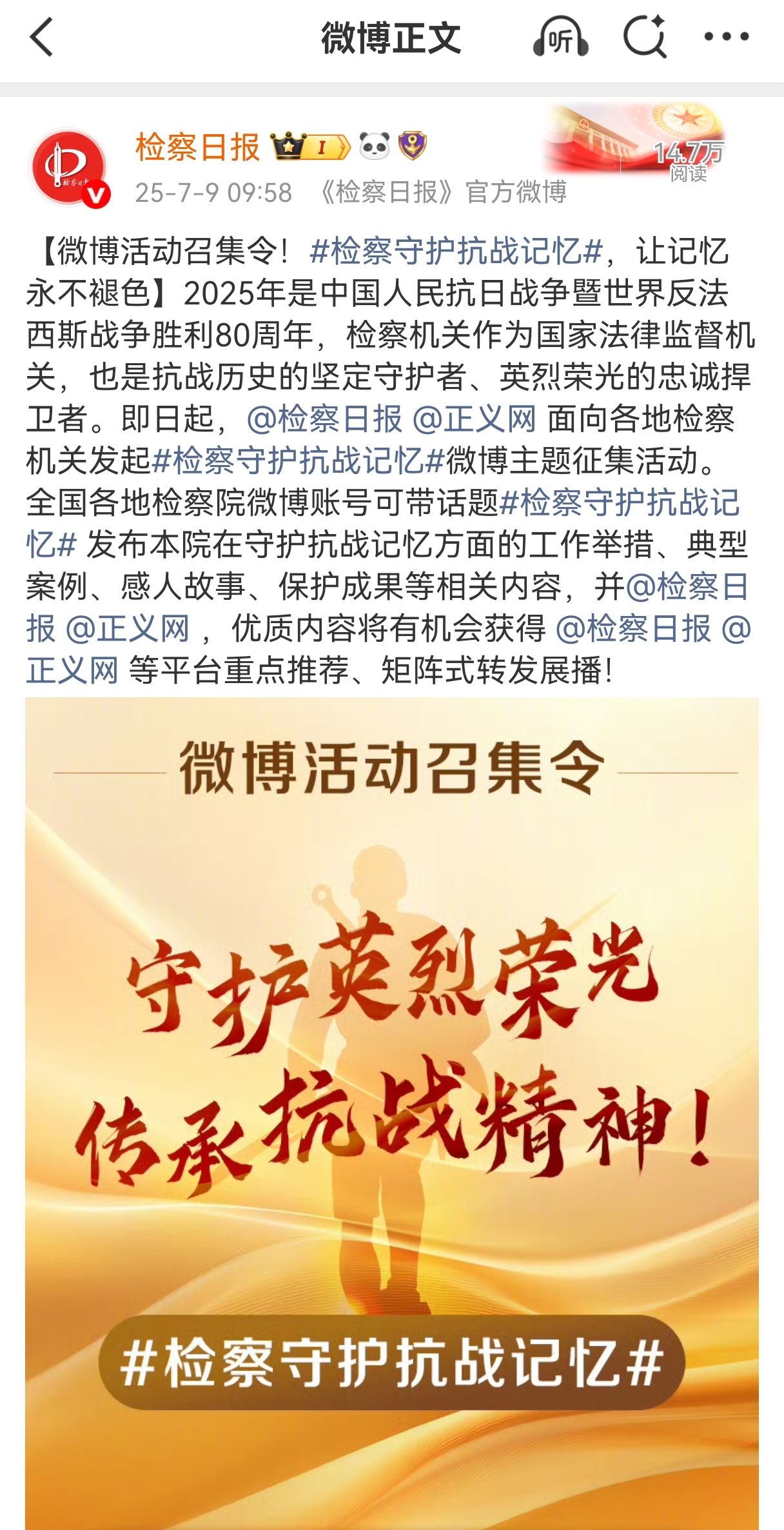 八十年歲月鎏金,八十年精神永續(xù)。當時光的指針走向中國人民抗日戰(zhàn)爭暨世界反法西斯戰(zhàn)爭勝利80周年之際,那段山河浴血、眾志成城的壯闊史詩,依然在時光長河中激蕩著震撼人心的力量;赝榛,聚焦當下,檢察日報正義網(wǎng)推出大型融媒體專題,記錄那些銘記抗戰(zhàn)歷史、守護抗戰(zhàn)記憶、傳承抗戰(zhàn)精神的檢察身影和法治足跡。