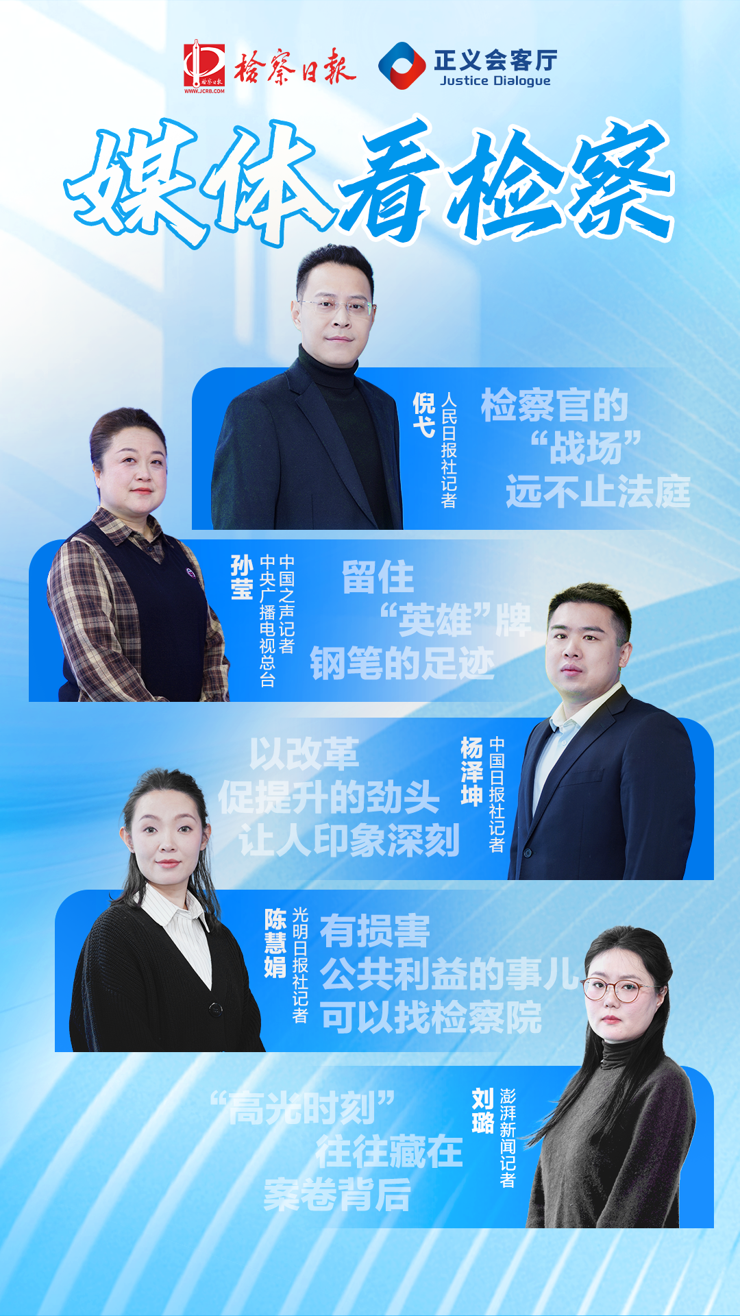 近日,檢察日報社特別邀請人民日報社、中央廣播電視總臺、光明日報社、中國日報社、澎湃新聞的“跑口記者”做客“正義會客廳”,圍繞他們眼里的檢察關鍵詞、印象深刻的案例及檢察官等,分享2025年采訪報道檢察工作的體會和感受。
