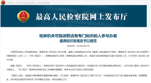 為規(guī)范和促進人民檢察院指派、聘請有專門知識的人參與辦案,最高檢近日印發(fā)《最高人民檢察院關(guān)于指派、聘請有專門知識的人參與辦案若干問題的規(guī)定(試行)》,明確檢察院可以指派、聘請有鑒定資格的人員,或者經(jīng)本院審查具備專業(yè)能力的其他人員,作為有專門知識的人參與辦案!兑(guī)定》指出,檢察院辦理刑事案件需要收集證據(jù)的,可以指派、聘請有專門知識的人開展下列工作:在檢察官的主持下進行勘驗或者檢查;就需要鑒定、但沒有法定鑒定機構(gòu)的專門性問題進行檢驗;其他必要的工作。