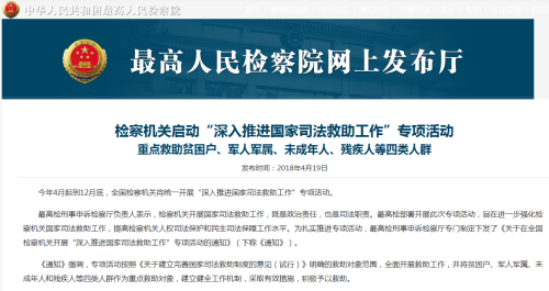 2018年4月起到12月底,全國(guó)檢察機(jī)關(guān)將統(tǒng)一開(kāi)展“深入推進(jìn)國(guó)家司法救助工作”專(zhuān)項(xiàng)活動(dòng)。為扎實(shí)推進(jìn)專(zhuān)項(xiàng)活動(dòng),最高檢刑事申訴檢察廳專(zhuān)門(mén)制定下發(fā)了《關(guān)于在全國(guó)檢察機(jī)關(guān)開(kāi)展“深入推進(jìn)國(guó)家司法救助工作”專(zhuān)項(xiàng)活動(dòng)的通知》。《通知》強(qiáng)調(diào),專(zhuān)項(xiàng)活動(dòng)按照《關(guān)于建立完善國(guó)家司法救助制度的意見(jiàn)(試行)》明確的救助對(duì)象范圍,全面開(kāi)展救助工作,并將貧困戶(hù)、軍人軍屬、未成年人和殘疾人等四類(lèi)人群作為重點(diǎn)救助對(duì)象,建立健全工作機(jī)制,采取有效措施,積極予以救助。