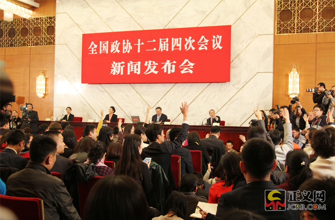 3月2日下午,全國政協(xié)十二屆四次會(huì)議新聞發(fā)布會(huì)在人民大會(huì)堂舉行,大會(huì)新聞發(fā)言人王國慶向中外媒體介紹本次大會(huì)有關(guān)情況并回答記者提問。正義網(wǎng)記者徐伯黎攝