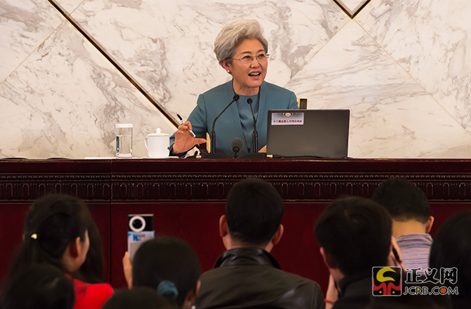 3月4日,十二屆全國人大四次會(huì)議在人民大會(huì)堂舉行新聞發(fā)布會(huì),大會(huì)發(fā)言人傅瑩回答中外記者的提問。本次發(fā)布會(huì)共有18名中外記者提問,其中11位記者提問涉及法治話題,占提問總數(shù)的61%。民法典的編纂工作、慈善法、推進(jìn)全面依法治國、全國人大審議境外非政府組織管理法草案、全國人大立法、反腐敗、《中華人民共和國反家庭暴力法》、稅收法、涉黃涉毒或者微博禁言的演員、政府依法行政、《大氣污染防治法》等。正義網(wǎng)記者程丁攝