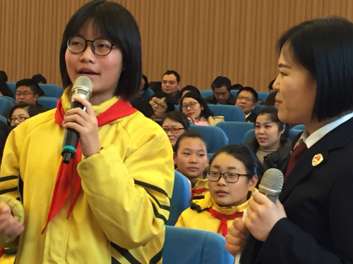 “青少年面對(duì)成長(zhǎng)道路中可能存在的不良影響,如何知法懂法守法,選擇正確的道路和方向…”檢察微電影《人生路口》中的娓娓講述,如同一道可口的餐前甜點(diǎn),一下就抓住了孩子們的心。接著,由最高檢從全國(guó)擇選出的兩名優(yōu)秀檢察官,又以新穎生動(dòng)的課件、豐富充實(shí)的故事、親切幽默的語(yǔ)言,為孩子們“精調(diào)細(xì)做”了《莫讓網(wǎng)事不堪回首》、《電影中的普法劇》兩道大菜。面對(duì)料鮮而味足的“美餐”,孩子們不僅“嘗”得津津有味,甚至“擼起袖子”踴躍互動(dòng),參與到“烹制美餐”的行列,現(xiàn)場(chǎng)氣氛十分火爆。