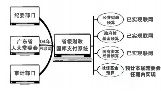 2004年,廣東省人大財(cái)經(jīng)委實(shí)現(xiàn)了與省財(cái)政廳國庫集中支付系統(tǒng)聯(lián)網(wǎng),廣東在全國率先實(shí)現(xiàn)省級公共財(cái)政預(yù)算支出聯(lián)網(wǎng)監(jiān)督。2010年,省級和21個地級以上市全部實(shí)現(xiàn)了人大財(cái)經(jīng)委與財(cái)政部門、審計(jì)部門的聯(lián)網(wǎng),此外,廣東省人大常委會不斷拓展預(yù)算聯(lián)網(wǎng)監(jiān)督覆蓋面,推進(jìn)監(jiān)督從公共財(cái)政預(yù)算資金、政府性基金預(yù)算資金擴(kuò)大到國有資本經(jīng)營預(yù)算資金和社;痤A(yù)算資金。