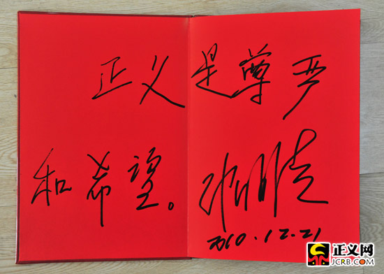 2010年12月21日,“童話大王”鄭淵潔為2010年度正義人物評(píng)選活動(dòng)題詞:“正義是尊嚴(yán)和希望”。