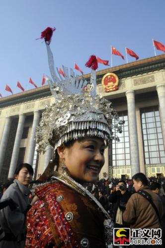 3月5日(星期三)上午9時(shí),第十一屆全國(guó)人民代表大會(huì)第一次會(huì)議在人民大會(huì)堂開(kāi)幕,美麗的貴州代表團(tuán)代表雷阿幼朵剛剛步入會(huì)場(chǎng)就引起記者們的騷動(dòng)。 程丁/攝