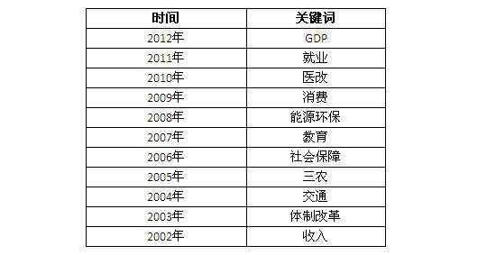 致十年——全國兩會政府工作報告回顧:該欄目分別回顧了從2002-2012這十年間兩會關鍵詞的主題變化,詳情如下: