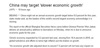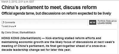 記者在谷歌新聞頁面上搜索兩會新聞,有數(shù)萬個相關結果,梳理其中的最新新聞發(fā)現(xiàn),外媒探討的重點有兩個:一是關注中國改革,二是關注2012年中國調(diào)低經(jīng)濟增長速度。