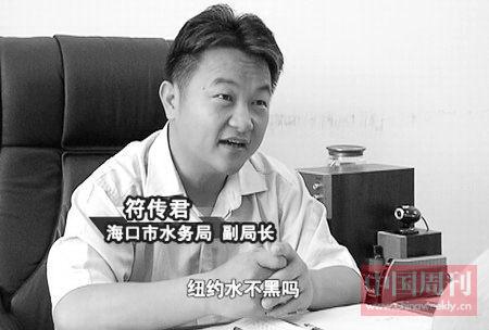 7月10日,網(wǎng)友“惡魔島”在新浪雜談發(fā)帖《最牛副局長回應(yīng)水污染治理:越發(fā)達(dá)水越黑!》,其中稱?谒畡(wù)局副局長在接受海南新聞頻道記者采訪時說,越發(fā)達(dá)的地區(qū),水就會越黑:7月6日,當(dāng)?shù)赜浾卟稍L符傳君問及“為什么常年未能解決海口污水”,符傳君卻回答“中山、東莞一帶,包括我們現(xiàn)在的在長江三角洲附近的、蘇州、浙江一帶,就是說只要發(fā)達(dá)的地區(qū),越發(fā)達(dá),水越黑。 ”