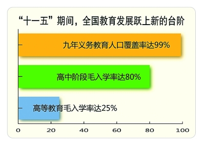 張力:“十一五”期間,全國教育發(fā)展躍上新的臺階,九年義務(wù)教育人口覆蓋率達99%,接近全面普及;高中階段毛入學(xué)率提升27個百分點,實現(xiàn)了80%的預(yù)期目標;高等教育穩(wěn)步發(fā)展,毛入學(xué)率從21%增至25%。如果說,新世紀第一個五年我國初步實現(xiàn)了從人口大國向人力資源大國的轉(zhuǎn)變,到第二個五年末,則可以說這一轉(zhuǎn)變的基礎(chǔ)更為牢靠。