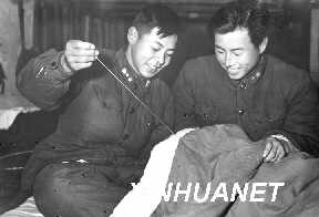 雷鋒(左)在幫助戰(zhàn)友縫被子