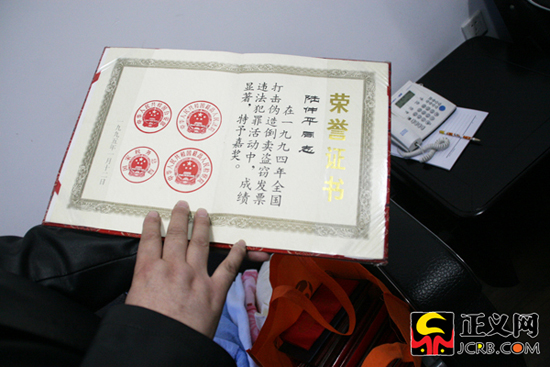 在老陸辦公室的角落里,我們發(fā)現(xiàn)有個(gè)手提袋,里邊竟是他多年來的榮譽(yù)證書:“優(yōu)秀共產(chǎn)黨員”、“法制宣傳先進(jìn)工作者”、“人民滿意政法干警”、“優(yōu)秀派駐檢察人員”……這其中最讓老陸感到自豪的,竟然是他在公訴部門時(shí)獲得的一張獎(jiǎng)狀:由公安部、最高人民法院、最高人民檢察院、國(guó)家稅務(wù)總局聯(lián)合頒發(fā),為表彰陸仲平在1994年打擊偽造倒賣盜竊發(fā)票違法活動(dòng)中的優(yōu)異表現(xiàn)。