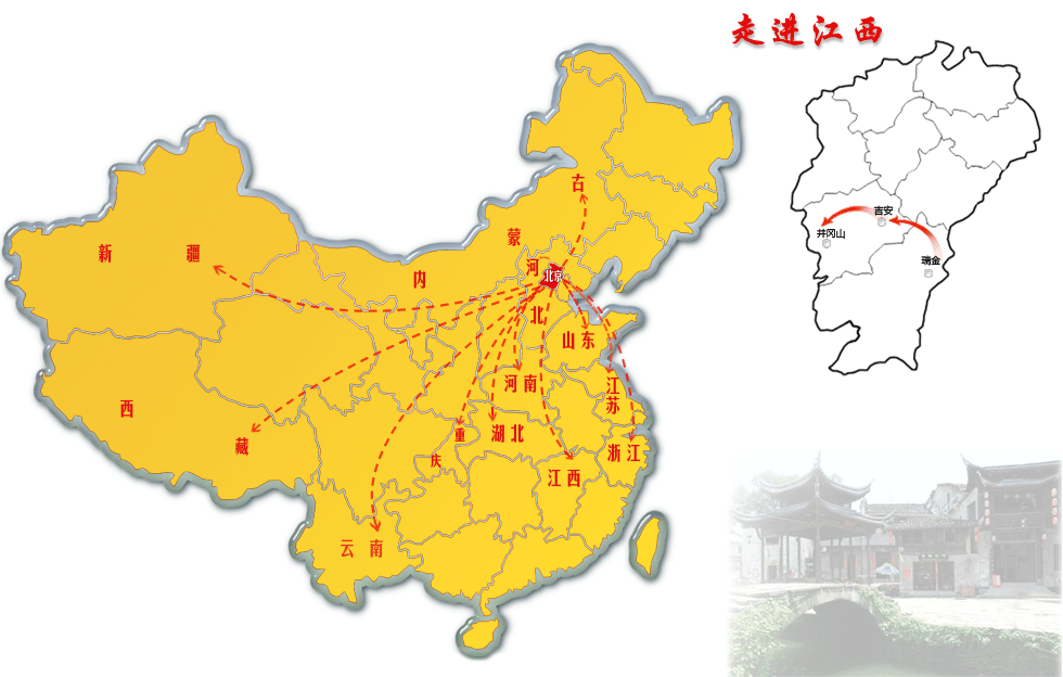瑞金,位于江西省東南邊陲,因地產(chǎn)黃金,金為瑞,故名。江西瑞金是一片具有光榮革命歷史的紅土地。20世紀(jì)30年代,中國共產(chǎn)黨領(lǐng)導(dǎo)創(chuàng)建以瑞金為中心的中央革命根據(jù)地(中央蘇區(qū))。井岡山既是一個旅游勝地,亦是一處革命圣地。從這里燃起的星星之火,后來蔓延成熊熊烈焰,最后紅遍了全中國。