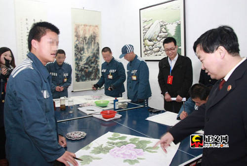 正義網(wǎng)記者與三門峽市檢察院駐硤石監(jiān)獄檢察室相關負責人觀看服刑人員藝術作品。姚宇/攝