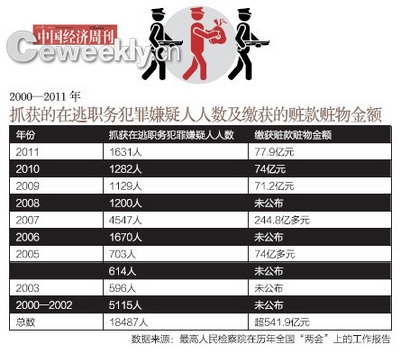 《中國經(jīng)濟(jì)周刊》從最高檢歷年“兩會”上的工作報(bào)告整理得知,自2000年底最高檢會同公安部組織開展追逃專項(xiàng)行動以來,至2011年,檢察機(jī)關(guān)共抓獲在逃職務(wù)犯罪嫌疑人18487名。而據(jù)最高檢公開發(fā)布的2005、2007、2009—2011年五年的數(shù)據(jù)顯示,我國這五年共繳獲贓款贓物金額達(dá)到541.9億元。
